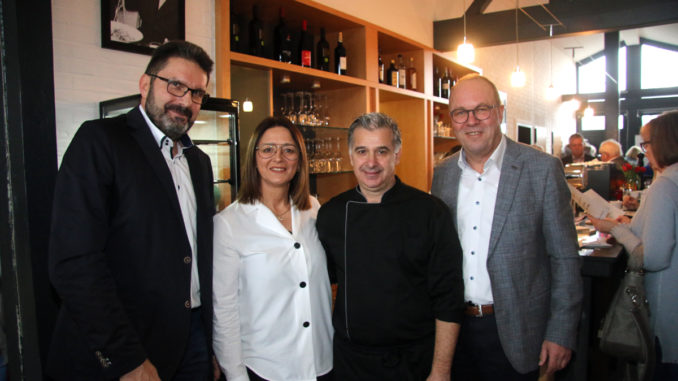 TC-Vorsitzende Egbert Symens (re.) und Geschäftsführer Jochen Walter (li.) mit dem neuen Pächterpaar Indira Delic und Giuseppe Calamato.