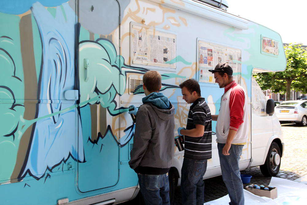 Geilenkirchen. Die Aktion des Stadtjugendringes Graffiti in the City wurde auch durch das „spannende Wetter“ nicht wesentlich getrübt. Die Sprayer, die ihre Fertigkeiten auf dem Marktplatz an einem Wohnmobil demonstrierten, sind aktive Mitglieder des Stadtjugendringes und zwischen 16 und 18 Jahre alt. Die Idee hatte Herr Rütten, ein Pflegevater des Jugendamtes. Eine vorausgegangene Graffiti-Aktion im Heyergäßchen erinnerte ihn an sein Wohnmobil, das er für diesen Anlass zur Verfügung stellte. Die Geilenkirchener Bevölkerung sollte die Möglichkeit haben, den Sprayern hautnah auf die Finger und auf die Leinwand bzw. das Wohnmobil schauen kann. Denn dann kann man die Leidenschaft der jungen Leute für diese Art von künstlerischer Betätigung vielleicht richtig verstehen.
