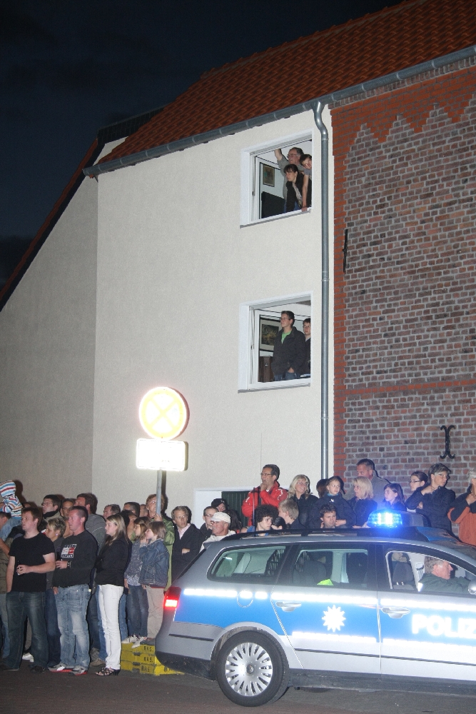 Geilenkirchen. In dieser Nacht sollte der Schwertransport nach Plan an der niederländischen Grenze ankommen. Doch schon eine halbe Stunde nach dem Start, gegen 22.45 Uhr, gab es unerwartete Schwierigkeiten am Grünen Warenhaus in Gillrath. Die Kurve Richtung Karl-Arnold-Strasse hielt die Fahrzeuge auf, da ein Hinweisschild der Historischen Eisenbahn im Weg stand und zudem einen Mauer den Schwenk um die Kurve behinderte. Alleine an dieser Stelle fanden sich mehrere hundert Schaulustige ein. Darunter war auch ein Großteil der Freiwilligen Feuerwehr Gillrath. Unmittelbar vor Erreichen des Schwertransports am Feuerwehrhaus mussten sie zu einem Einsatz ausrücken. Einige Minuten später wäre dies nicht so einfach möglich gewesen. Der Schwertransport wird im weiteren Verlauf der Nacht über Gillrath nach Gangelt und dann weiter über Süsterseel bis zur Grenze fahren. Sollten jedoch noch weitere Probleme auftreten, kann das Zeitfenster nicht eingehalten werden.