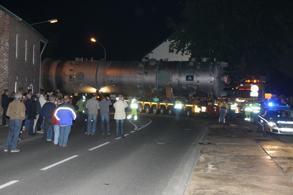 In der vergangenen Nacht wurde der Schwertransport mit einem Bauteil für die Firma BASF in Ludwigshafen quer durch Geilenkirchen befördert. Rund fünf Stunden dauerte das Schauspiel und wurde begleitet von rund 1000 Schaulustigen an den Straßenrändern. Der Transport verlief zwar nicht reibungslos, doch konnten alle Probleme auf der Wegstrecke gelöst werden. Der Schwertransport steht am heutigen Tag auf der K3 zwischen Teveren und Nierstraß. In der kommenden Nacht geht der Transport weiter in Richtung Grenz zu den Niederlanden.