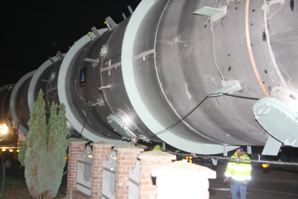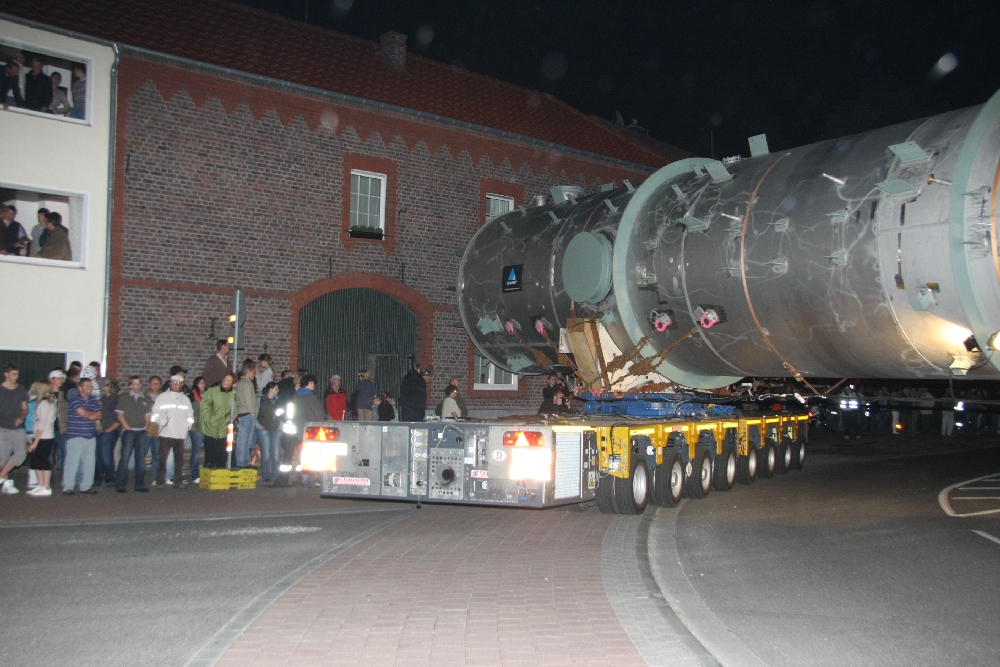 Geilenkirchen. Er ist unterwegs! Die Rede ist vom angekündigten Schwertransport, der seit Monaten eine logistische Meisterleistung erfordert. Von Eschweiler geht es in den Hafen nach Echt nach Südlimburg, wo das Bauteil per Schiff sser nach Ludwigshafen gebracht wird. Die erste Etappe wurde in der letzten Nacht von Eschweiler bis zum Parkplatz an Gut Muthagen zwischen Boscheln und Geilenkirchen geschafft. Das 83 Meter lange Bauteil ist für das Pharma-Unternehmen BASF in Ludwigshafen. Mit 331 Tonnen ist es zu schwer, um Brücken zu überqueren. „Ich plane diesen Transport seit über drei Monaten, und wir werden nun zumindest bis in die Niederlande kommen. Unser größtes Problem sind die Behörden. In den Niederlanden benötigen wird kurzfristige Genehmigungen. Ich weiß noch nicht, wie schnell wir diese bekommen“, so der Leiter des Transport, Ulrich Böhmer.