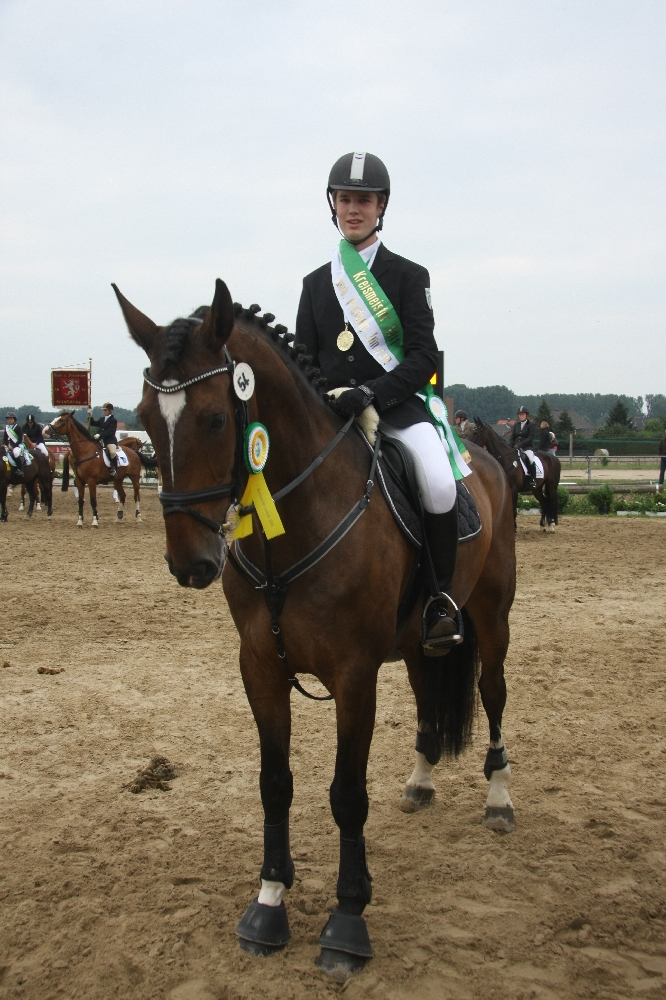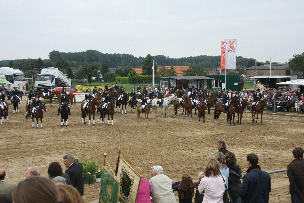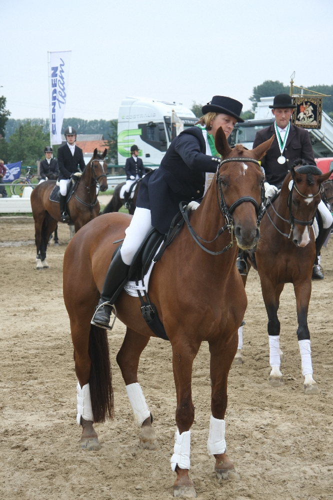 Heinsberg. Der Kreisverband Heinsberg der Reiter suchte am vergangenen Wochenende in zahlreichen Alter- und Leistungsklassen die besten Reiter des Kreises. Über 30 Prüfungen wurden innerhalb von drei Tagen durchgeführt. Dabei hatte der ausrichtende Verein, der Reit- und Fahrverein Vinn, in diesem Jahr das „Glück des Tüchtigen“. Kein Regen und Temperaturen um die 20 Grad waren optimale Bedingungen für die Teilnehmer. Schon am Freitag und Samstag war der Besuch auf der Anlage in Kirchohven-Vinn gut. Am Abschlusstag durfte sich der RV Vinn über ein „Volles Haus“ freuen. So fand der Kreisvorsitzende der Reitsportvereine, Hans-Peter Molls, ausschließlich lobende Worte für die Ausrichtung dieser Veranstaltung. Der Aufmarsch aller Reitvereine des Kreises sowie die Ehrungen der Kreismeister waren am Sonntagabend die letzten Höhepunkte. Geehrt wurden jeweils die ersten drei Reiter der verschiedenen Kategorien. Als einziger Reiter konnte Patrick Kirschbaum in zwei Disziplinen eine Medaille errringen. Sowohl in der kombinierten Prüfung für Junioren als auch im A-Springen belegte er den zweiten Platz. Der Reitverein Geilenkirchen war der große Gewinner dieses Wochenendes. Beide Standarten, sowohl für die Jugend, als auch für die Senioren, ging an die Geilenkirchener. Die genauen Platzierungen der Kreismeisterschaften können auf der Seite www.pferdesport-heinsberg.de in Kürze nachgeslesen werden. Unser Bild zeigt Philipp Erdweg vom RV Geilenkirchen (Sieger in der kombinierten Prüfung) sowie der Zweitplatzierte, Patrick Kirschbaum und Sharon Sevriens (3. Platz) sowie Vertreter des Kreisverband und der RV Vinn. Alle Ergebnisse der Veranstalung finden sie auf der Seite www.orgasport.de