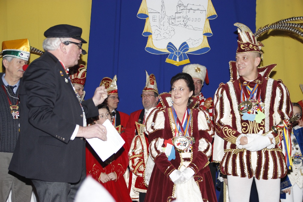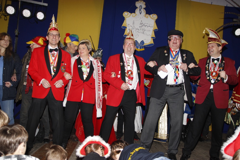 Geilenkirchen.Die Jecken haben am Freitag die Verwaltung in Geilenkirchen übernommen. Aus der Hand von Bürgermeister Thomas Fiedler bekamen sie den Stadtschlüssel, der bis Aschermittwoch die Türen der Stadt öffnet. Nicht wie üblich vor dem Rathaus, sondern im Zelt am Markt wurde die diesjährige Rathausstürmung durchgeführt. Bereits Tage zuvor wurde aufgrund des „zu erwartenden, schlechten Wetter“ die Veranstaltung von „outdoor“ nach „indoor“ gelegt. Der Wettergott meinte es jedoch an diesem Tag gut mit den Jecken. Zum Zeitpunkt der Rathausstürmung herrschte bestes Winterwetter mit Sonnenschein und Temperaturen über dem Gefrierpunkt. Eine Lösung, die es nicht noch einmal geben sollte. Denn die Karnevalsfreunde drängten sich im engen Zelt und es kam zu keinem Zeitpunkt die Stimmung auf, die es auf dem Rathausvorplatz alljährlich gibt. Wir haben eine Galerie mit Bildern der Rathausstürmung zusammengestellt.