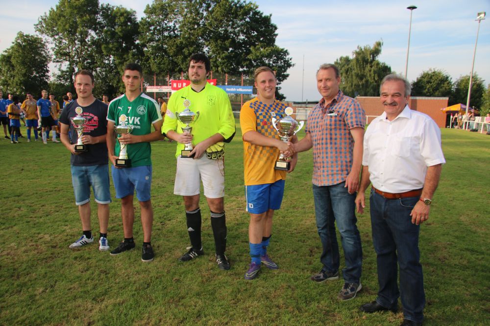 Siegerehrung in Kraudorf. Germania Teverens Kapitän nimmt den Stadtpokal aus den Händen des Schirmherrn entgegen.