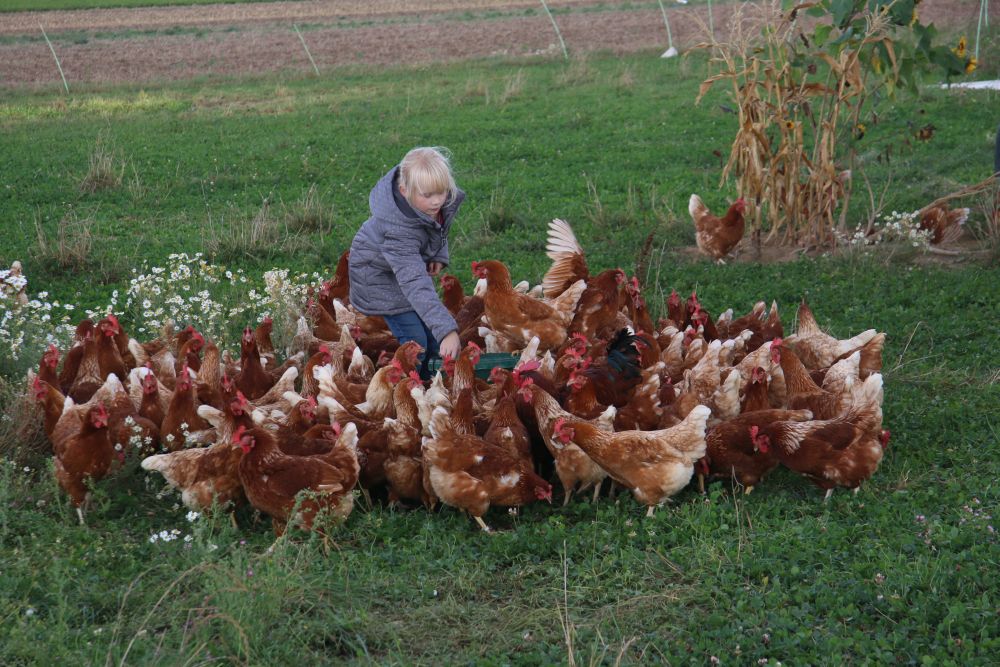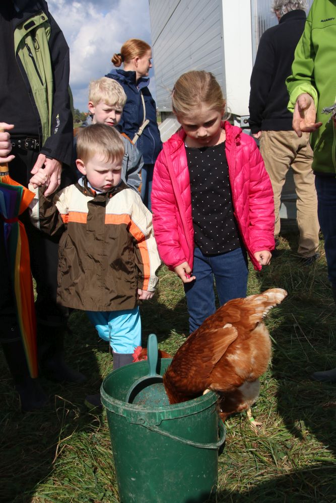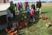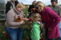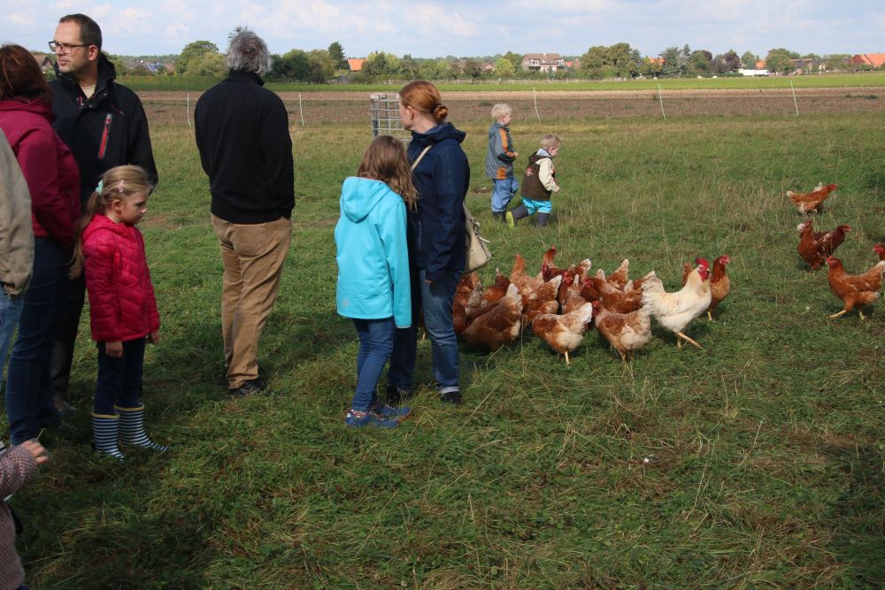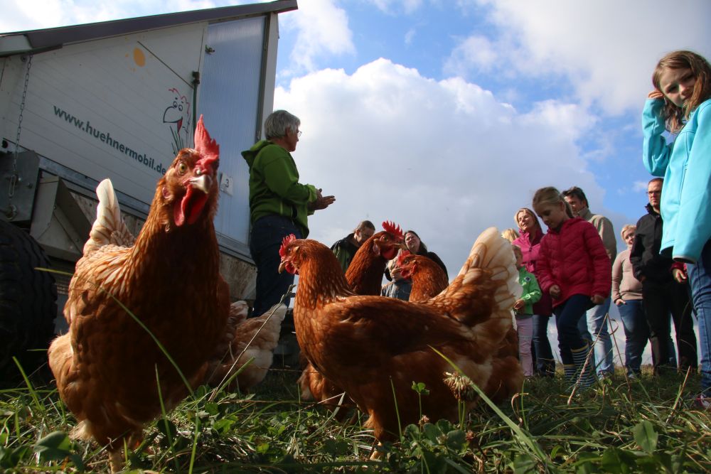 Geilenkirchen. Der Tag der Deutschen Einheit stand wieder einmal ganz im Zeichen der Kinder und Familien: Die Sendung mit der Maus hatte zum bundesweiten „Türöffner-Tag“ aufgerufen. Sachgeschichten live gab es auf den Hühnerwiesen des Bioland Betriebes „Hildes Grünzeug“ in Geilenkirchen. Hilde und Harald Volles führten an drei Terminen mehr als 100 Kinder durch ihre fahrbaren Hühnerställe. Dabei wurde den Kindern und auch den Erwachsenen die Arbeitsweise eines „Bio-Bauern“ erklärt. In den abgezäunten Bereichen gab es an diesem Tag Hühner zum Anfassen. Überrascht waren die Kinder darüber, dass die Tiere nicht scheu waren und sich sogar auf den Arm nehmen ließen.