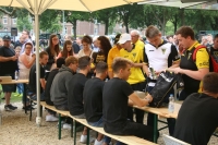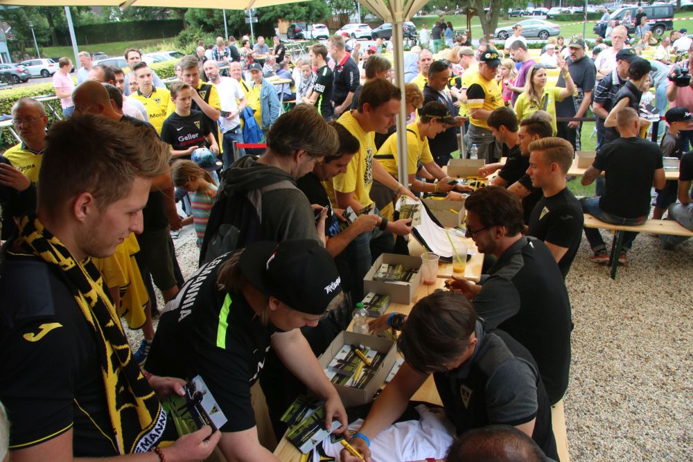 Geilenkirchen. Die „große Familie“ Alemannia Aachen feierte am Wochenende zum dritten Mal die Saisoneröffnung auf dem Gelände des Sportpark Loherhof. Wie bereits in den vergangenen Jahren bot Gastgeber Fred Solty den Alemannen eine heimische Atmosphäre mit direktem Kontakt zu Fans und Sponsoren. Beim Familienfest dund um den Sportpark tummelten sich mehr als 1000 Fussballbegeisterte. Sie zeigten, dass der Klub auch in den derzeit schweren Zeiten die notwendige Unterstützung von den richtigen Fans erhält. Vor allem den neuen, jungen Spielern wurde an diesem Tag vermittelt, dass der Aachener Traditionsverein etwas besonderes ist. Hier ein Smalltalk mit den Fans, an anderer Stelle ein Kick mit dem Nachwuchs und zur Stärkung dann ein saftiges Steak oder eine Bratwurst. Einige Spieler versuchten sich im angrenzenden Golfpark mit den „Tücken“ des Ballsport mit Schläger. Bleibt zu hoffen, dass die neue Mannschaft um Trainer Fuat Kilic die Lockerheit auch in das erste Spiel der Saison am Freitag, 28. Juli, 19.30 Uhr auf dem Tivoli mitnimmt. Dann ist als erster Gegner der neuen Spielzeit die Reserve von Borussia Mönchengladbach zu Gast. Für alle Fans und Freunde der Alemannia heißt es dann wieder: Der 13. Mann ist wichtiger denn je!