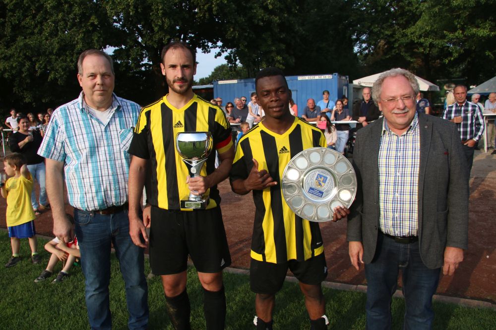 Heinz-Josef von St. Vieth(li.) und BM Georg Schmitz überreichten Pokal und Wanderteller an die Spieler von Germania Bauchem.