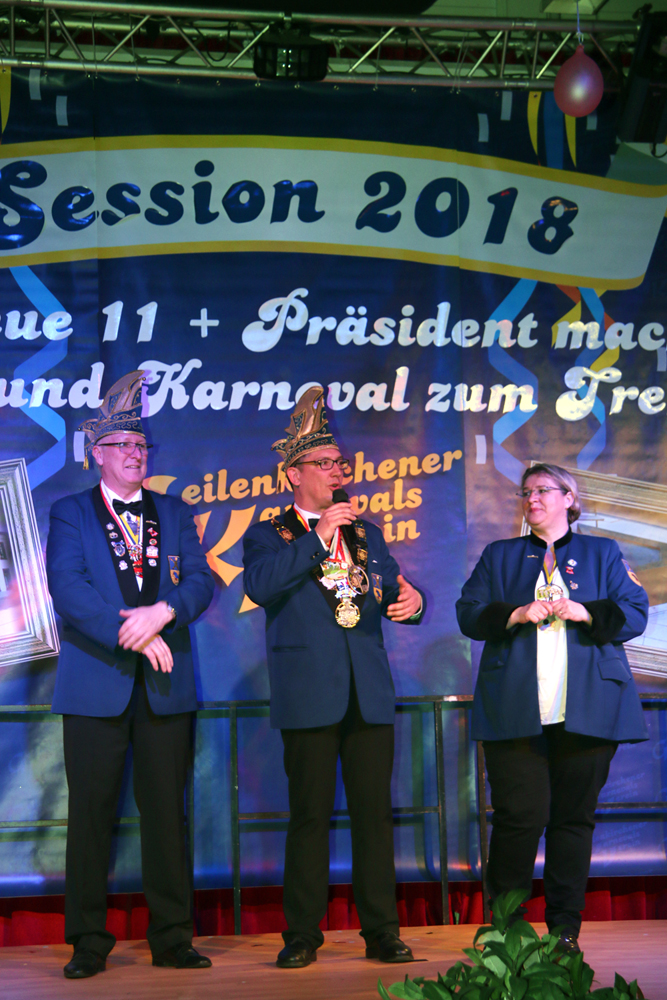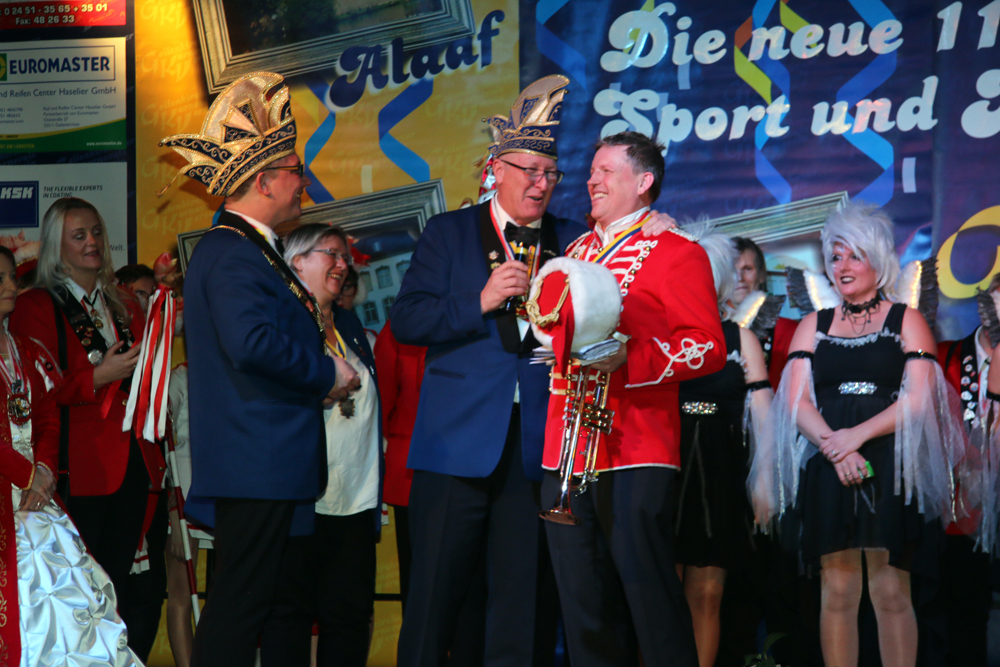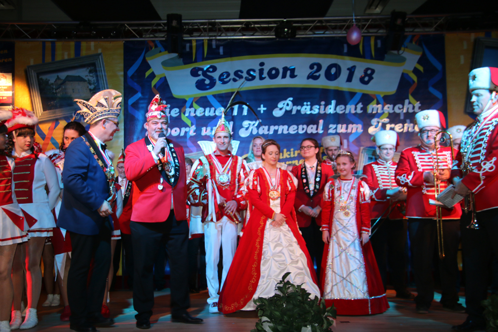 Geilenkirchen. Den ersten großen karnevalistischen Höhepunkt gab es am Sonntag in der Geilenkirchener Luna Lounge. Der GKV startete mit dem „Biwak“ in die heiße Phase der Session 2017/18. Mehr als sieben Stunden stellten sich die befreundeten Karnevalsvereine vor und es tanzten die Mariechen und Show-Tanzgruppen. Der Präsident des Geilenkirchener Karnevalverein, Marko Banzet, führte über viele Stunden durch das Programm. nicht ohne Grund waren die Jecken der Würmer Wenk um kurz vor 19 Uhr der Schlusspunkt des bunten Treiben. Seit vielen Jahren pflegen beide Vereine eine enge Freundschaft, die darin verankert ist, dass sowohl die Geilenkirchener, als auch die Würmer in beiden Vereinen als Mitglieder geführt werden. Alle? Nein einer fehlte noch. Geschäftsführer und Funkenoffizier Guido Küppers ist noch nicht Mitglied beim GKV. Der 1.Vorsitzende des GKV, Bert Krückel, nahm dies zu Anlass, der „Würmer“ bei der Verabschiedung gleich den Mitgliedsantrag mitzugeben. Ob er diesen noch am Abend unterschrieb ist nicht bekannt.  Für den GKV steht am Freitag, 2. Februar, mit der Galasitzung der nächste Höhepunkt auf dem Programm.