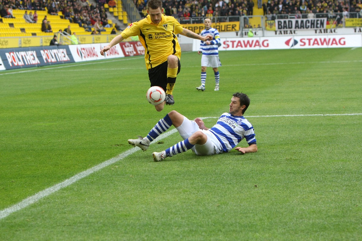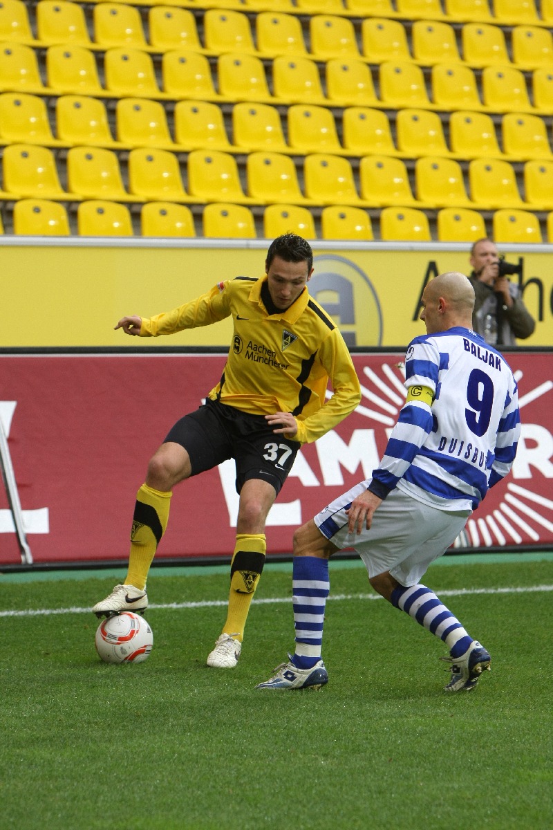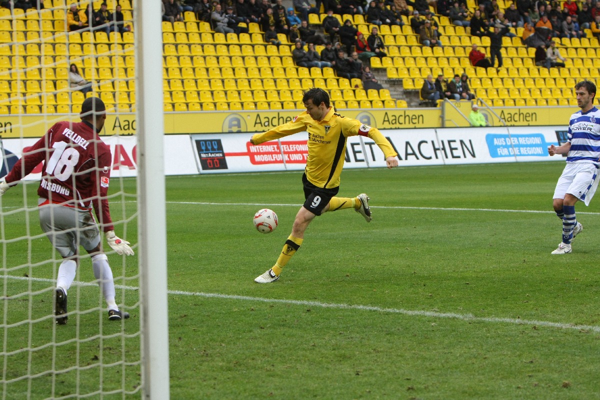 Aachen. Am 12. Spieltag der 2. Bundesliga kommt Alemannia Aachen gegen den MSV Duisburg nicht über ein 2:2 hinaus. Die Gastgeber fingen schwach an und überliesen den Zebras aus Diusburg die ersten 20 Spielminuten. Danach kam die Mannschaft von Trainer Peter Hyballa besser ins Spiel und erarbeitete sich einige gute Einschussmöglichkeiten. Doch bist zur Halbzeit blieb es torlos. Die Aachener kamen besser aus der Kabine und spielten nur so, wie es die Mehrheit der 19000 Besucher am Tivoli erwarteten. Marco Höger erlöste die Fans in der 64. Minute mit der Führung per Kopf. Drei minuten später ein umstrittener Foulelfmeter für Duisburg. David Hohs ist in der richtigen Ecke, kann den strammen Schuss von Sukalo aber nicht abwehren. Als eine Minute danach Duisburgs Soares mit „Rot“ vom Platz gestellt wurde, schien die Partie gelaufen. Aachen setzte alles auf eine Karte und lief in der 71. Spielminute in einen Konter, der den MSV durch Baljak in Führung brachte. Nun kochte der Tivoli. Die Mannschaft von Trainer Peter Hyballa baute immer mehr Druck auf und dieser wurde fünf Minuten vor dem Ende auch belohnt. Goalgetter Benny Auer nahm einen Kopfball von Höger im Strafraum auf und stand frei vor MSV-Keeper Yelldell und schob zum verdienten Remis ein.