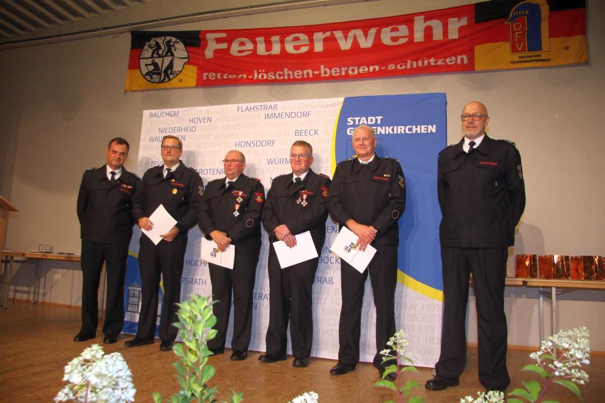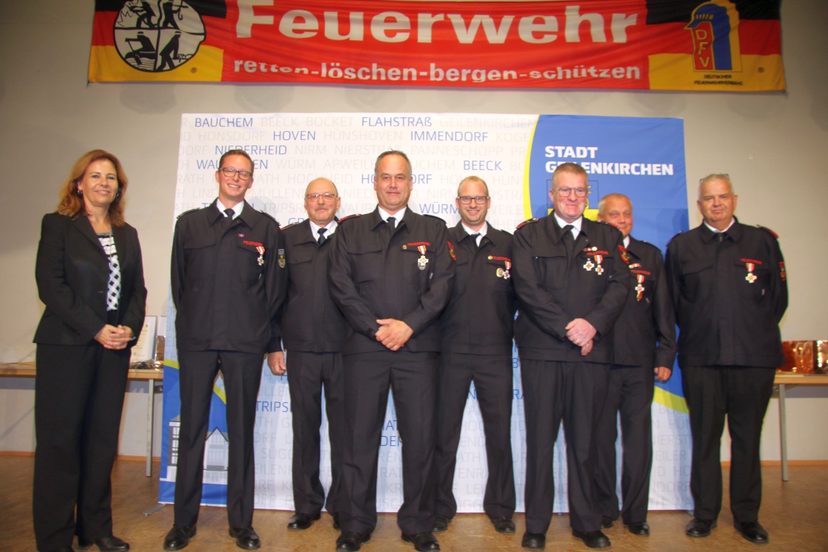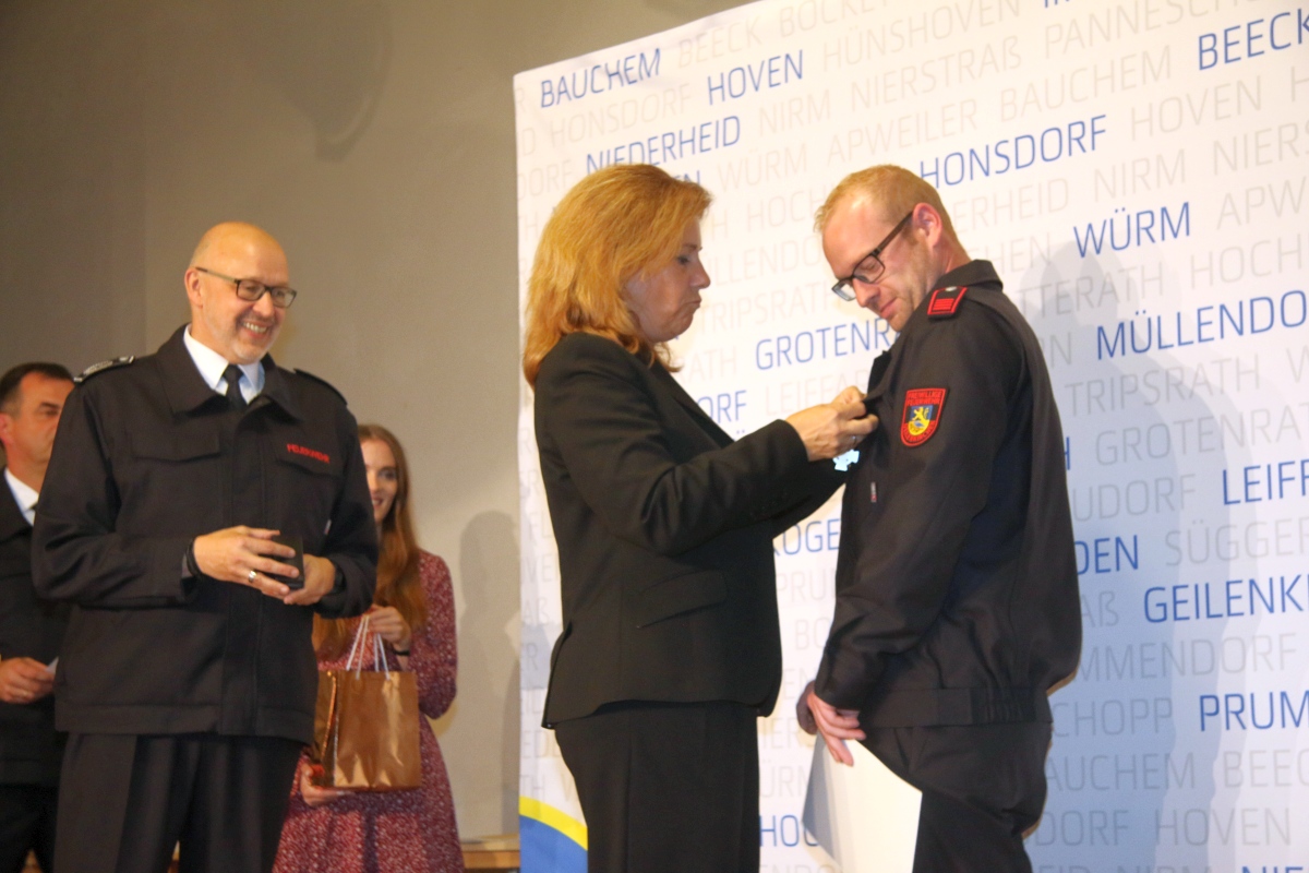 Geilenkirchen. In der Bürgerhalle von Würm wurden Mitglieder der Freiwilligen Feuerwehr der Stadt Geilenkirchen für ihre Verdienste geehrt. Zum zweiten Mal wurden als Anerkennung für besondere Vedienste um die Feuerwehr Geilenkirchen Mitglieder mit den neuen Ehrenzeichen des Landes NRW in Silber und Gold gewürdigt.Bürgermeisterin Daniela Ritzerfeld hob in ihrer Begrüßung die Wichtigkeit der Feuerwehr hervor. „Wenn sie gebraucht werden sind sie da. Und das auch rund um die Uhr und unentgeltlich“, so Ritzerfeld.