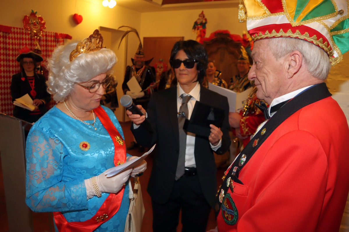Geilenkirchen. Seit Jahren ist es eine gute Tradition, dass die Stadt Geilenkirchen eine Woche vor Beginn des Straßenkarnevals zum Prinzenempfang in das Haus Basten einlädt. Bürgermeisterin Daniela Ritzerfeld konnte die Vertretungen der Geilenkirchener Karnevalsvereine samt Prinzenpaare und Anhang im vollbesetzen Haus Basten begrüßen. Die Übergabe der Regentschaftsurkunden an die Prinzenpaare ist ebenso ein altes Ritual. Neu hingegen war die Art und Weise. Die „Queen“ (Roswitha Beckers) hatte die Ehre, den jecken Prinzenpaaren ihre Urkunden zu überreichen. Natürlich war das royale Oberhaupt mit Security und Übersetzer in Person von „Gabriel“ (Anja Wallbaum) erschienen. Das Stadtprinzenpaar Axel I. & Vera II. Jungen, vom IKV Teveren, konnte die erste Regentschaftsurkunde in Empfang nehmen. Die etwas andere Prozedur kam bei den Repräsentanten der Karnevalsvereine sehr gut an. Es passte einfach zum jecken Rahmen.