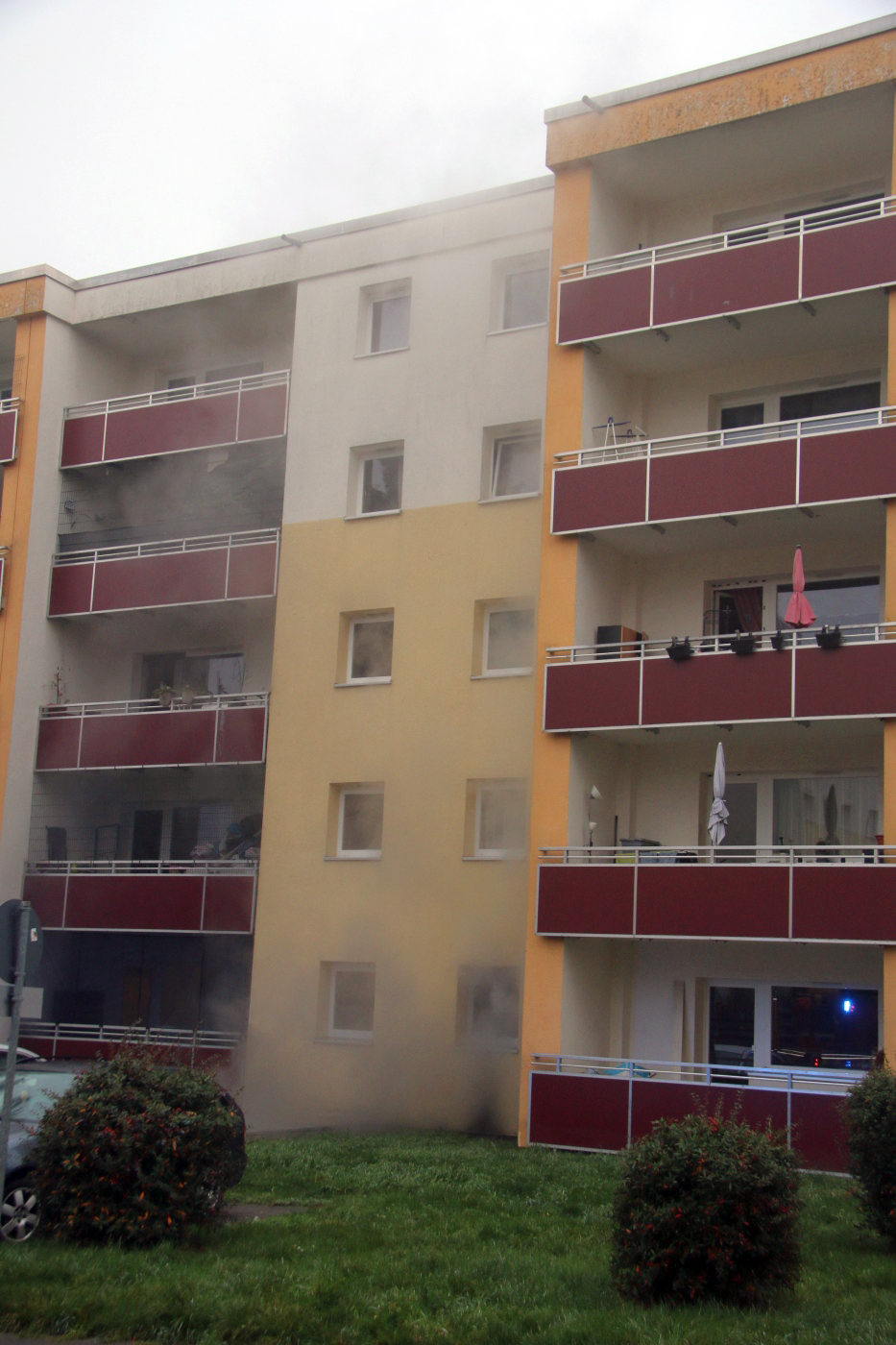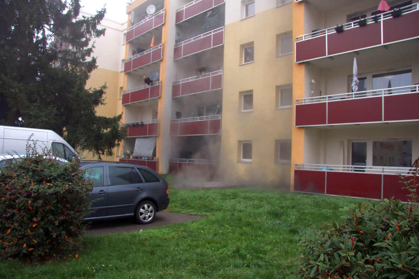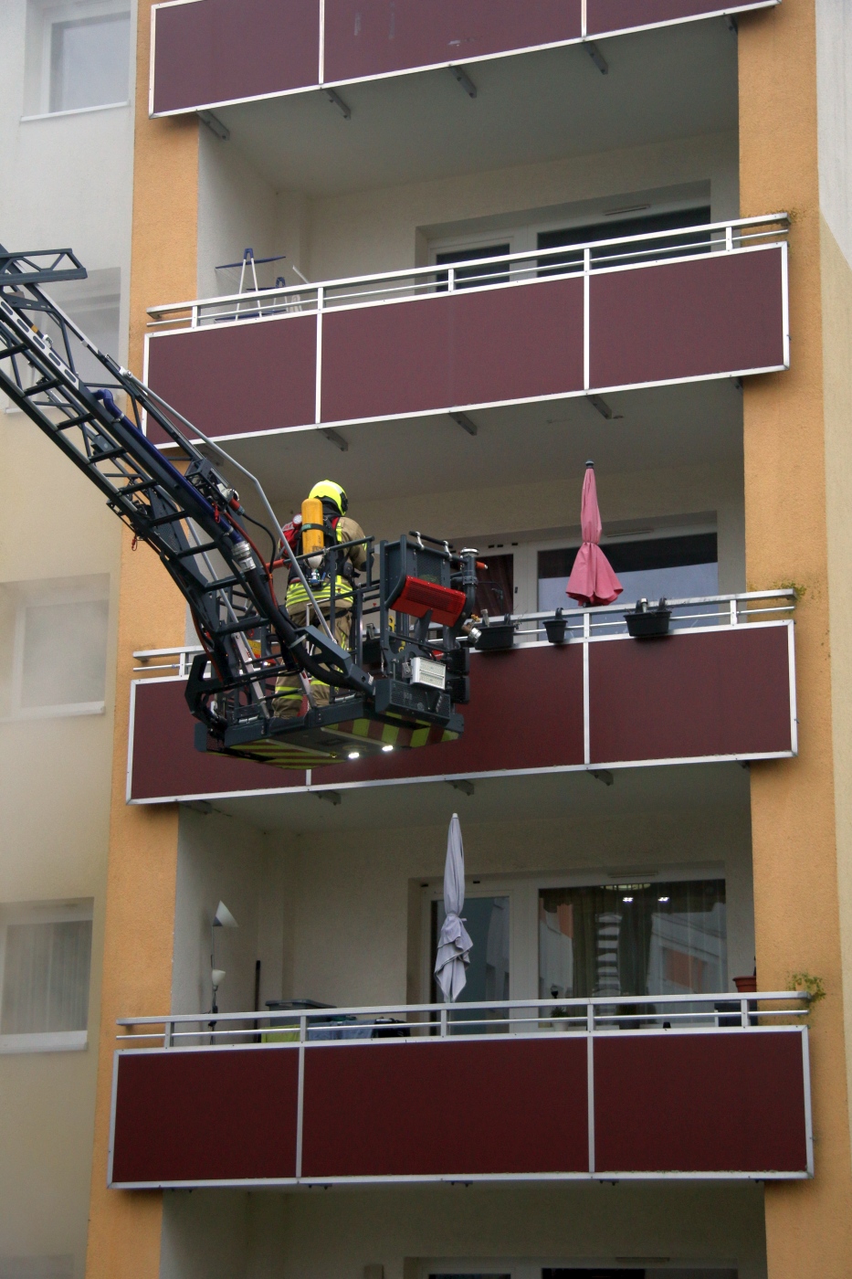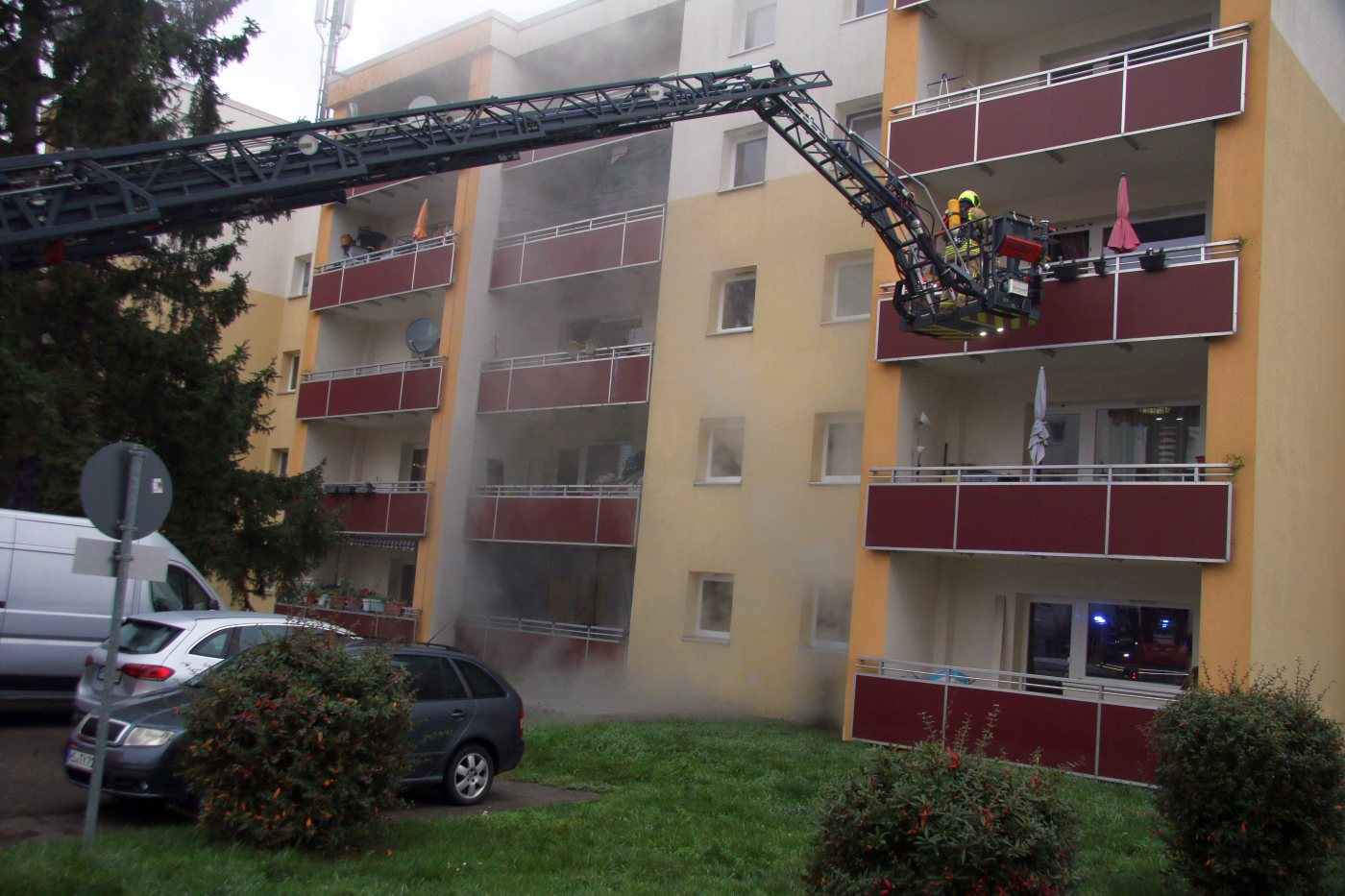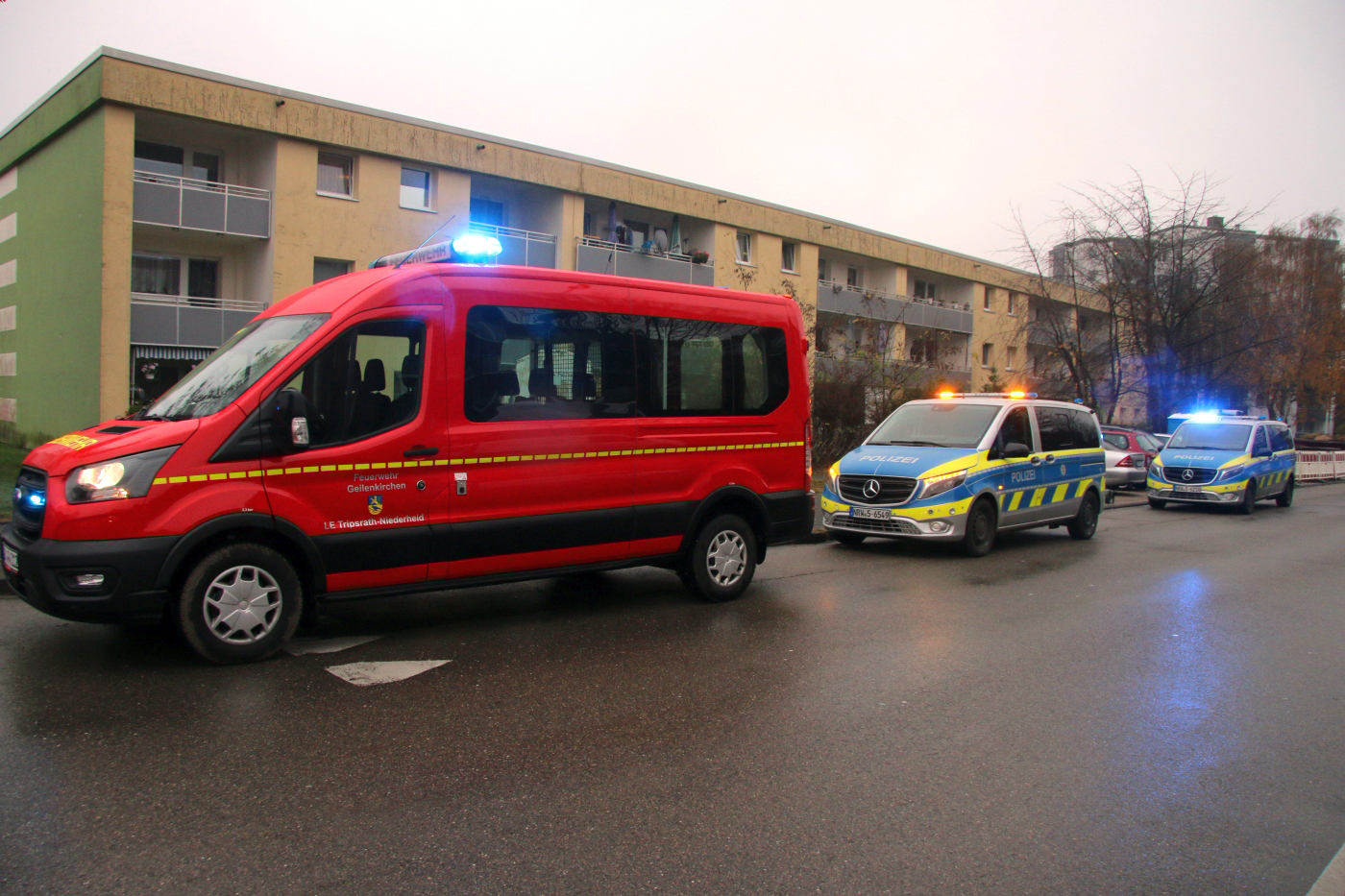 Auch der Leiterwagen der Feuerwehr kam zum Einsatz, falls Personen aus dem Wohnblock evakuiert werden müssen.
