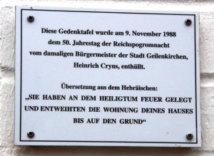 Der frühere Bürgermeister Heinrich Cryns enthüllte am 9. November 1988 zum 50-jährigen Gedenken an die Reichspogromnacht die Gedenktafel, die an der Fassade angebracht ist. Darauf steht folgender Text, der aus dem Hebräischen übersetzt wurde: